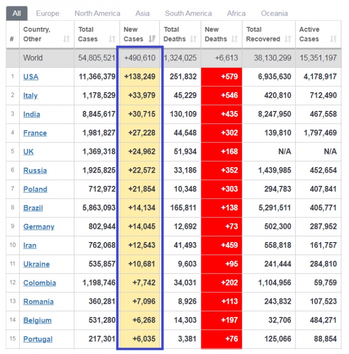 Станом на момент публікації, в світі зафіксовано 54 мільйонів випадків зараження. Успішно перенесли хворобу і вилікувалися 38 мільйонів пацієнтів. Вже померло 1 324 317 пацієнтів з COVID-19.