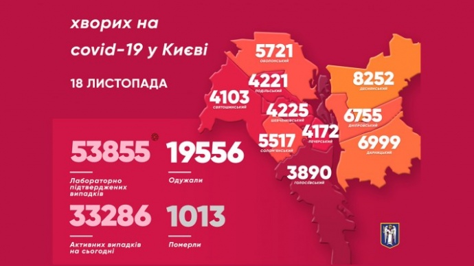 Деталі: Підтверджених випадків захворювання в столиці станом на 18 листопада 53 855. Усього коронавірус подолали 19 556 мешканців Києва. Хвороба забрала життя 1013 киян.