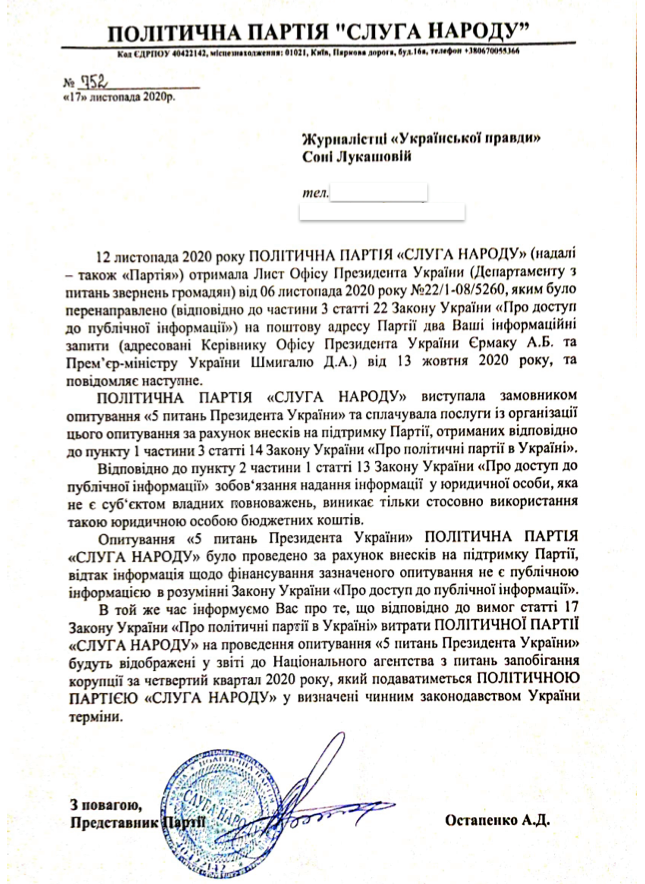 Згодом ОП прислав листа, в якому не відповів на жодне із запитань і повідомив, що переслав запит до "Слуги народу" як організатора опитування.