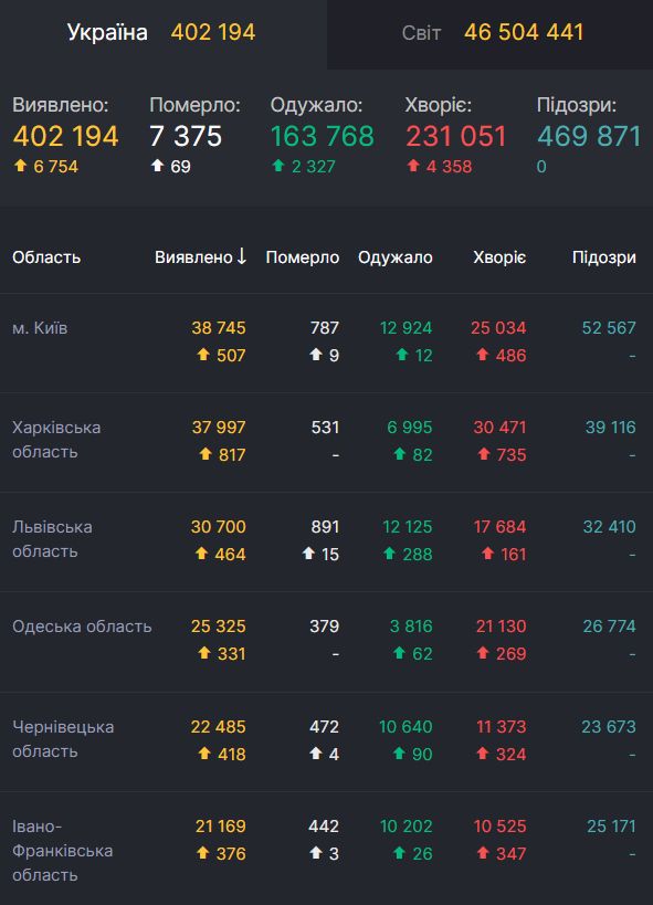 За добу 1 листопада в Україні діагноз COVID-19 підтвердили 6 754 особам, померли 69 хворих, одужали 2 327 пацієнтів.