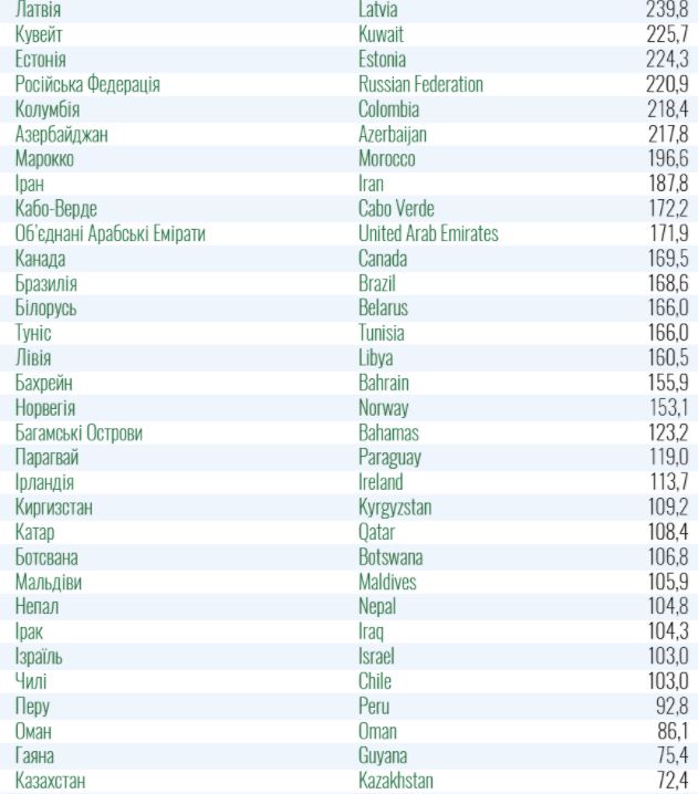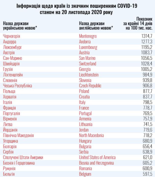 Україна включає до "червоного списку" держави, де кількість нових випадків на 100 тисяч населення за останні 14 днів перевищує аналогічний показник в Україні.