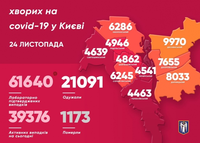 За весь час пандемії в Києві було підтверджено вже 61 640 випадків захворювання на COVID-19, коронавірус забрав життя 1 173 киян, а подолав цю хворобу 21 091 мешканець столиці.