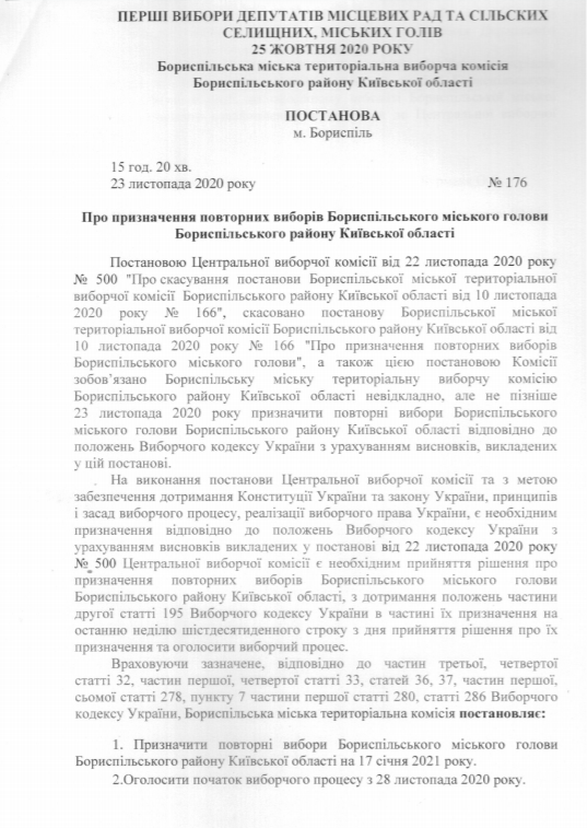 Станом на вечір 23 листопада, Бориспільська ТВК оприлюднила свою постанову.