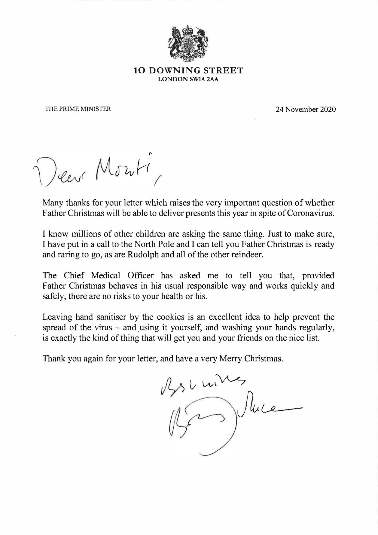 Прем'єр-міністр Великої Британії Борис Джонсон відповів на лист 8-річного британця, який цікавився, чи вплинуть цьогорічні карантині обмеження, зумовлені поширенням COVID-19, на роботу Санта Клауса.