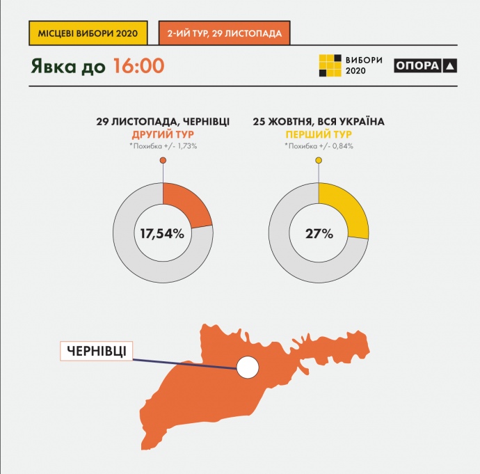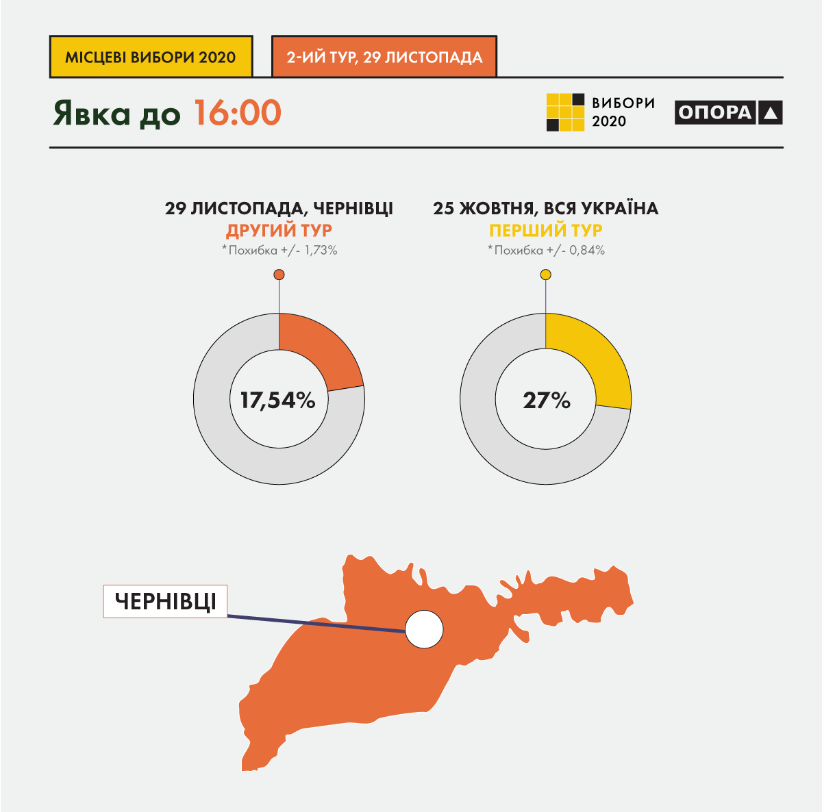 Дослівно: "Явка виборців у Чернівцях станом на 16:00 склала 17,54% (похибка – 1,73%).