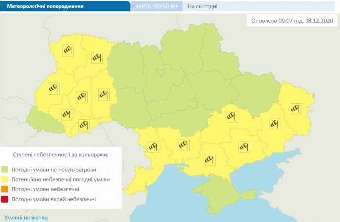 Деталі: 8 грудня у західних, південних та південно-східних областях синоптики прогнозують пориви вітру 15-20 м/с (І рівень небезпечності, жовтий).