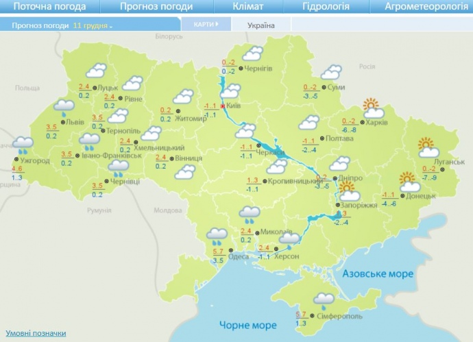 Температура повітря вночі очікується 0-3 градуси морозу, на Сході, а також на Полтавщині, Сумщині, у Дніпрі з районами -3-7 градусів, на Одещині та в Криму +2+6 градусів.