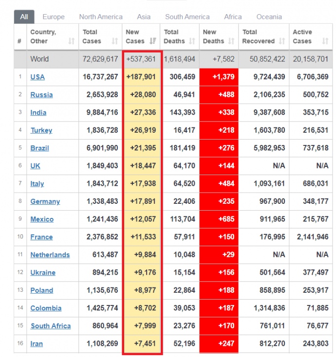 Наразі всього в світі діагностовано 72 мільйони випадків зараження коронавірусом, 50 мільйонів хворих вилікувалися, 1 610 173 пацієнтів з COVID-19 померло. Продовжують боротися з хворобою понад 20 мільйонів людей.