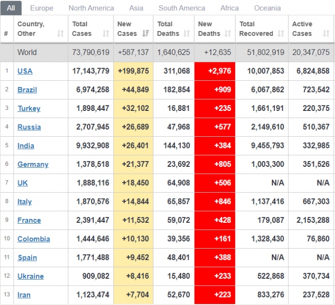 Україна тримає 12 позицію серед країн світу за кількістю нових хворих станом на 14 грудня. Також наша держава далеко не відійшла і за числом смертей за вказаний період – 13 місце у світі.