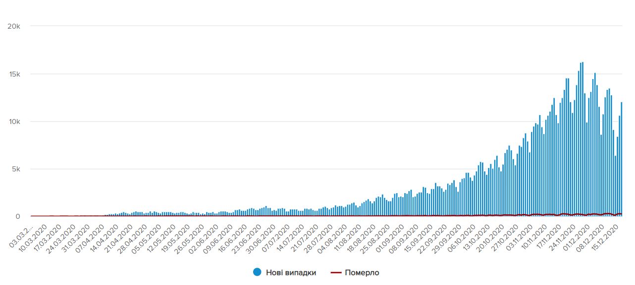 За добу 16 грудня в Україні діагноз COVID-19 підтвердили 12 047 особам, одужали при цьому 12 939 осіб, у лікарні потрапили 2 997 хворих із коронавірусом або підозрою на нього, померли від ускладнень 252 пацієнти.
