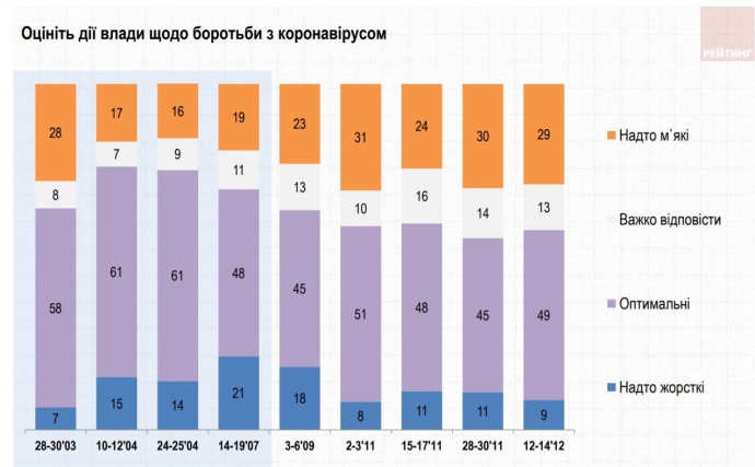 При цьому 49% опитаних вважають заходи, запроваджені владою щодо боротьби із коронавірусом, оптимальними, 29% вважають їх надто м’якими, 9% – навпаки надто жорсткими.
