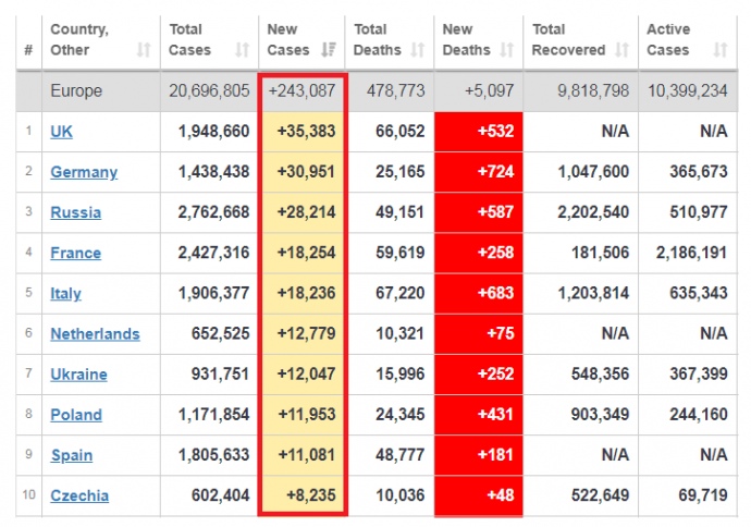 Деталі: У країнах Європи лідерами антирейтингу за кількістю нових випадків COVID-19 є Великобританія, Німеччина, Франція, Італія, Нідерланди та Україна. У відповідному світовому антирейтингу Україна тримається на 12-му місці.
