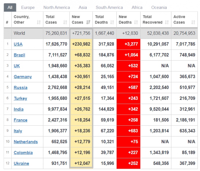 Наразі всього в світі діагностовано 75 мільйонів випадків зараження коронавірусом, 52 мільйони хворих вилікувалися, 1 666 173 пацієнтів з COVID-19 померло. Продовжують боротися з хворобою понад 20 мільйонів людей.