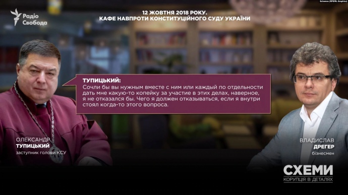 Тупицький, який на той момент був заступником голови Конституційного суду, покликав на зустріч у кафе поблизу КСУ свого знайомого, донецького бізнесмена Владислава Дрегера, який на той момент, як виявилося, вже співпрацював з правоохоронцями та записав ту розмову.