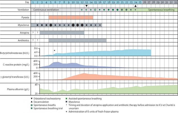 Дослівно: "У нашого пацієнта результат був дуже добрим. Мабуть, вирішальними були інтубація і штучна вентиляція легень протягом 2-3 годин після появи симптомів і відсутність попередньої важкої гіпоксії. Початок і тривалість терапії атропіном протягом перших 2 днів (у РФ – ред.) залишаються неясними.