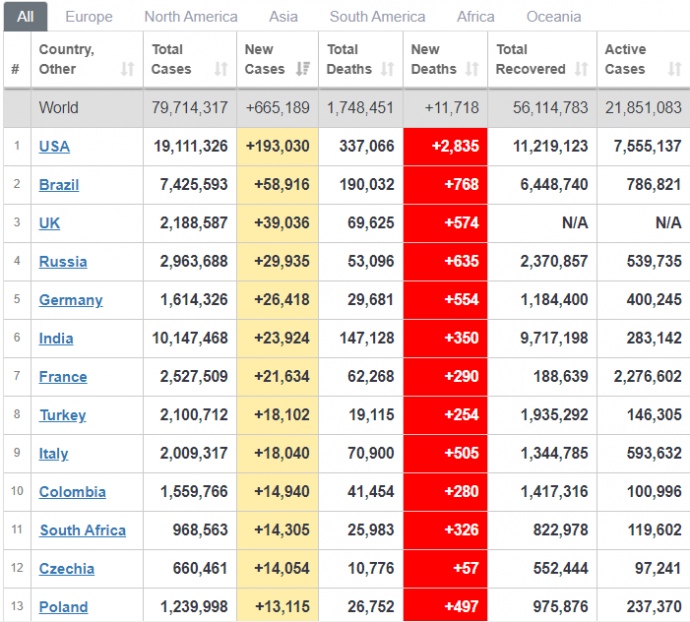 Зокрема, в США виявили більше 192 тисяч, у Бразилії – майже 59 тисяч, у Великій Британії – близько 39 тисяч. Також значну кількість хворих зафіксували у Росії, Німеччині, Індії та Франції.