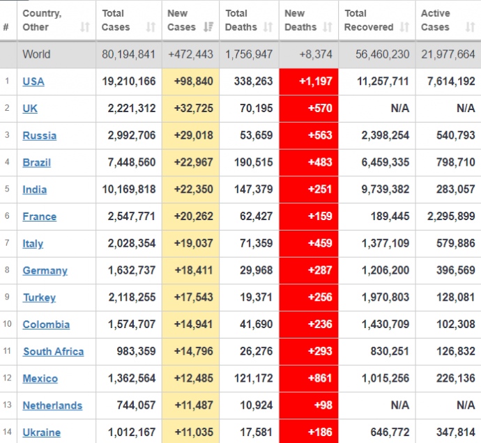 За минулу добу у світі підтвердили понад 472 тисячі випадків захворювання на коронавірус, таким чином за час пандемії COVID-19 виявили у 80,2 мільйона осіб.