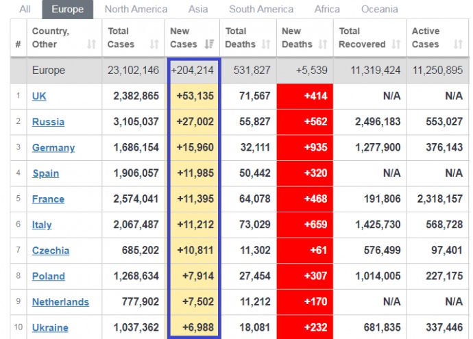 Деталі: У країнах Європи лідерами антирейтингу за кількістю нових випадків COVID-19 є Великобританія, Німеччина, Іспанія, Франція, Італія, Чехія та Україна, яка займає 10-ту позицію. У відповідному світовому антирейтингу Україна на 19-му місці.