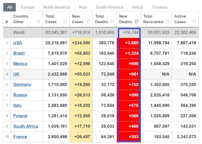 Наразі всього в світі діагностовано 83 мільйони випадків зараження коронавірусом, 58 мільйонів хворих вилікувалися, 1 812 046 пацієнтів з COVID-19 померло.