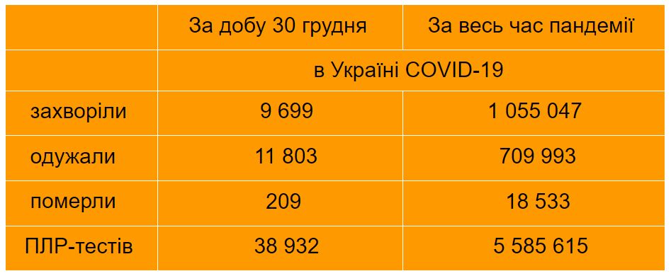 За добу 30 грудня в Україні діагноз COVID-19 підтвердили 9 699 особам, одужали 11 803 особи, однак 2 704 хворих потрапили до лікарні, а 209 пацієнтів померли.