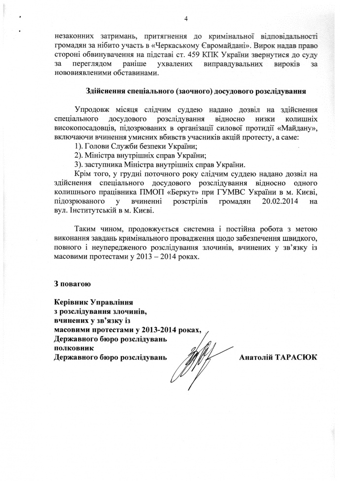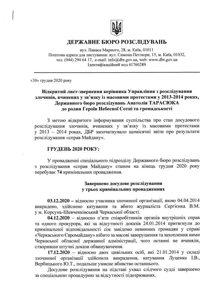 Дослівно: "З метою відкритого інформування суспільства про стан досудового розслідування злочинів, вчинених у зв’язку із масовими протестами у 2013 – 2014 роках, ДБР започаткувало щомісячні звіти про "справи Майдану".