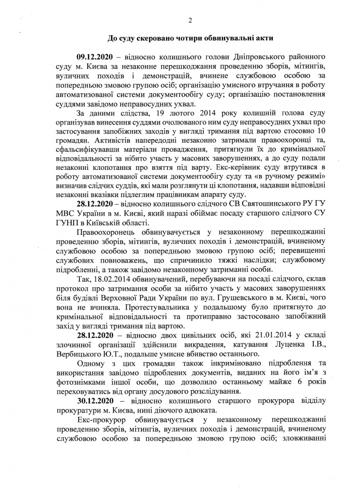 Зазначається, що 17 грудня судом ухвалено перший обвинувальний вирок на підставі обвинувального акту у "справі Майдану", розслідуваній Управлінням з розслідування злочинів, вчинених у зв'язку із масовими протестами у 2013-2014 роках, Державного бюро розслідувань.