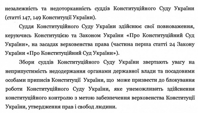 Збори суддів КСУ звертають увагу на неприпустимість недодержання органами державної влади та посадовими особами приписів Конституції України, що може призвести до блокування роботи Конституційного Суду України, яке унеможливить здійснення конституційного контролю з метою забезпечення верховенства Конституції України, утвердження прав і свобод людини.