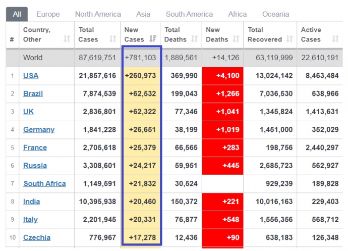 Станом на 6 січні в світі за добу діагностували рекордні 780 тисяч нових заражень COVID-19. Померло за останню добу 13 570 ковід-хворих.