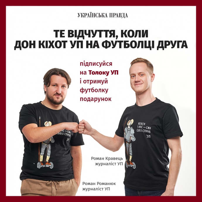 УП дарує футболку з оновленим Дон Кіхотом кожному підписнику Толоки УП, який підтримає видання від 1000 грн на рік. Акція діє до 7 січня.