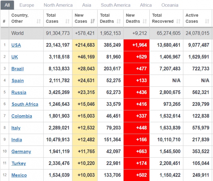 За минулу добу у світі підтвердили понад 578 тисяч випадків захворювання на коронавірус, загалом – 91,3 мільйона інфікувань.