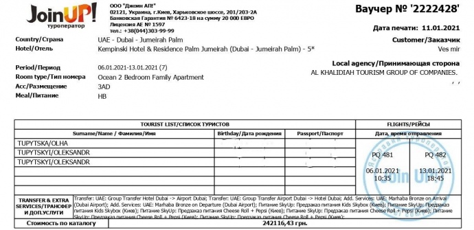 Вартість пакету послуг, наданого туристичним оператором на трьох осіб, становить 242116,43 грн. У вартість туру входить авіапереліт в обидва боки, проживання у двокімнатному номері готелю, дворазове харчування, трансфер, страхування та вартість туристичного обслуговування.