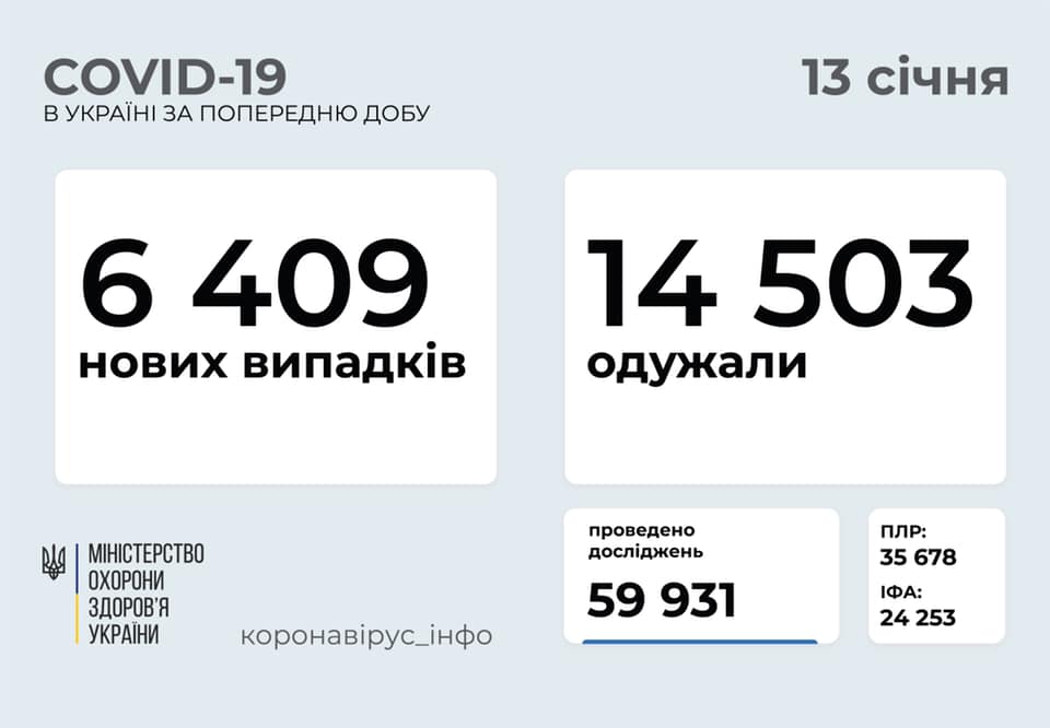 За добу 12 січня в Україні зафіксували 6 409 нових випадків коронавірусної хвороби COVID-19, одужали 14 503 особи, у лікарні потрапили 2 564 хворих, померли від ускладнень 195 пацієнтів.