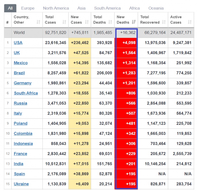 Наразі всього в світі діагностовано 92 мільйона випадків зараження коронавірусом, 64 мільйона хворих вилікувалися, 1 984 134 пацієнтів з COVID-19 померло.