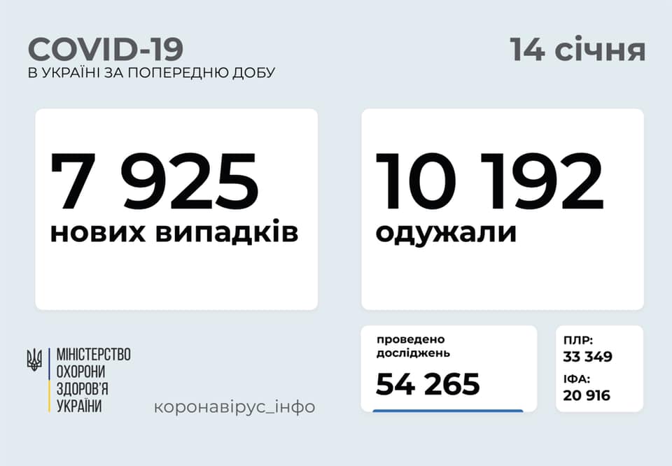 За добу 13 січня в Україні діагноз COVID-19 підтвердили 7 925 осіб, одужали 10 192 особи, у лікарні потрапили 2 229 хворих із коронавірусом чи підозрою на нього, 162 пацієнти померли від ускладнень коронавірусної хвороби.