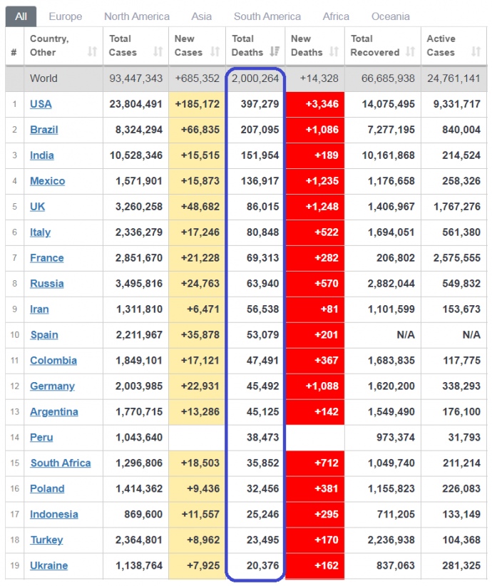 Станом на 14 січні в світі підтверджено 2 000 264 смерті від COVID-19, зокрема 14 328 за останню добу.