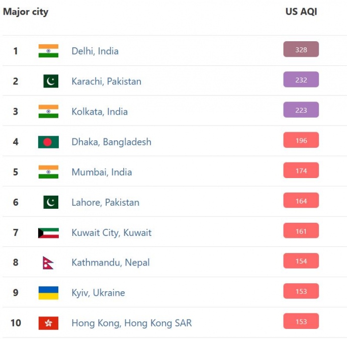 Антирейтинг очолює Делі (Індія), слідом йдуть Карачі (Пакистан) та Колката (столиця індійського штату Західна Бенгалія).
