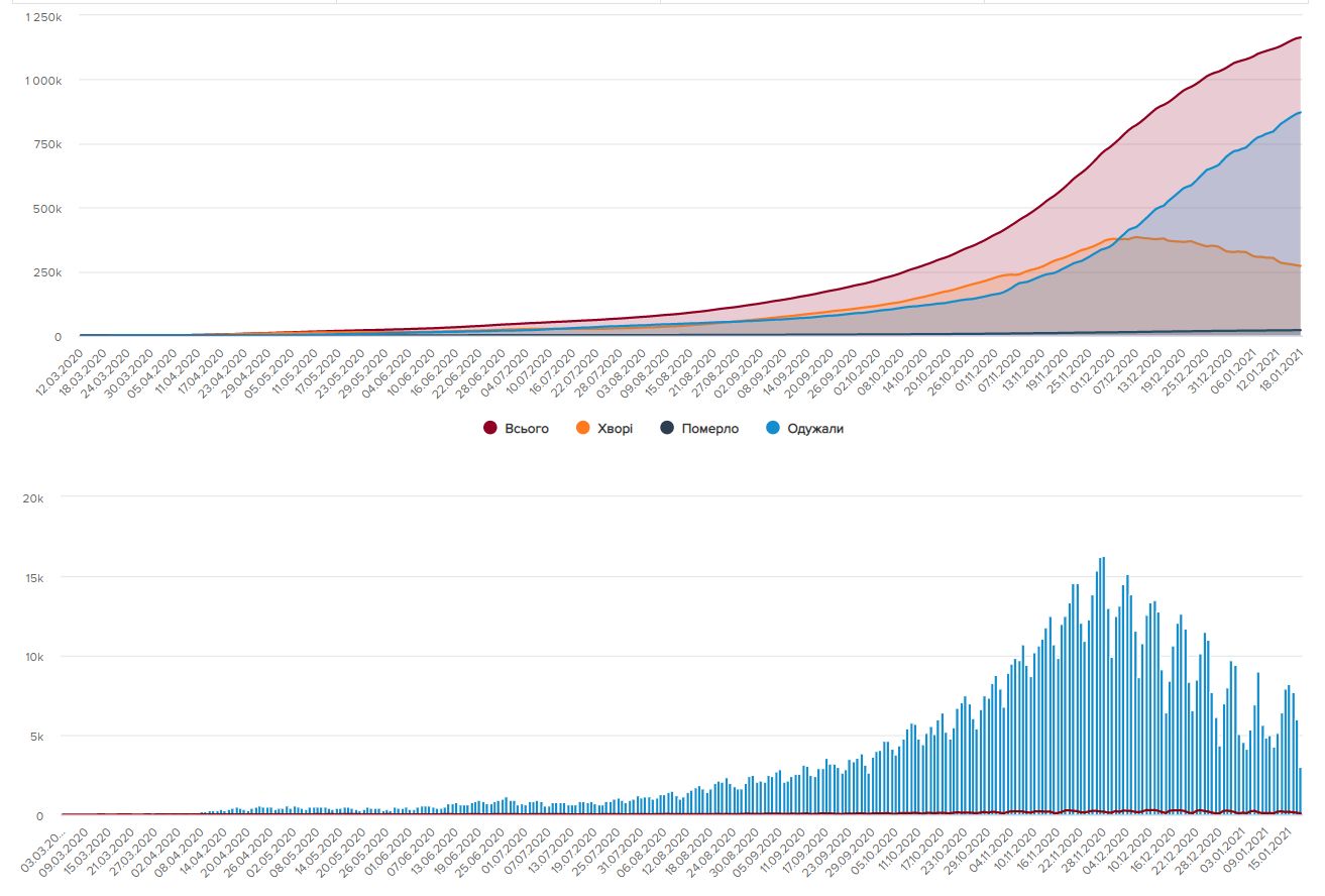 За весь час пандемії в Україні було виявлено 1 163 716 хворих на коронавірус SARS CoV 2, з них 871 196 осіб одужали, 20 869 осіб померли