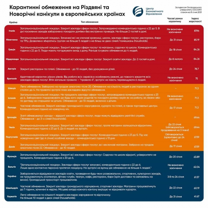 Деталі: 12 січня міністр Кабінету міністрів Олег Немчінов повідомляв, що Україна належить до переліку країн із найбільш м'якими карантинними обмеженнями, згідно з індексом Оксфордського університету.