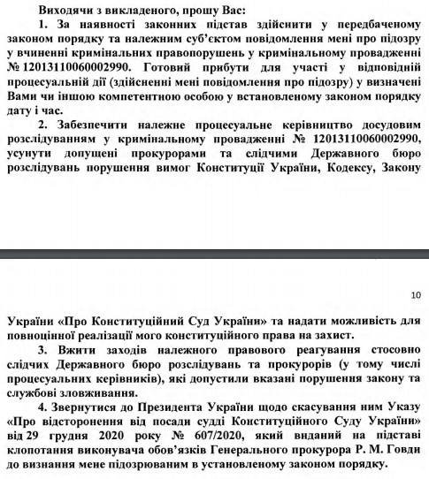 Він називає справу проти нього сфальсифікованою і політично вмотивованою і просить Венедіктову, щоб йому було на законних підставах повідомлено про підозру. Він готовий прийти у назначений час.