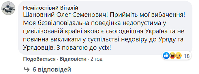 На цей пост міністра відреагував юзер на ім’я Віталій Немілостівий. Він попросив вибачення за негідну поведінку.