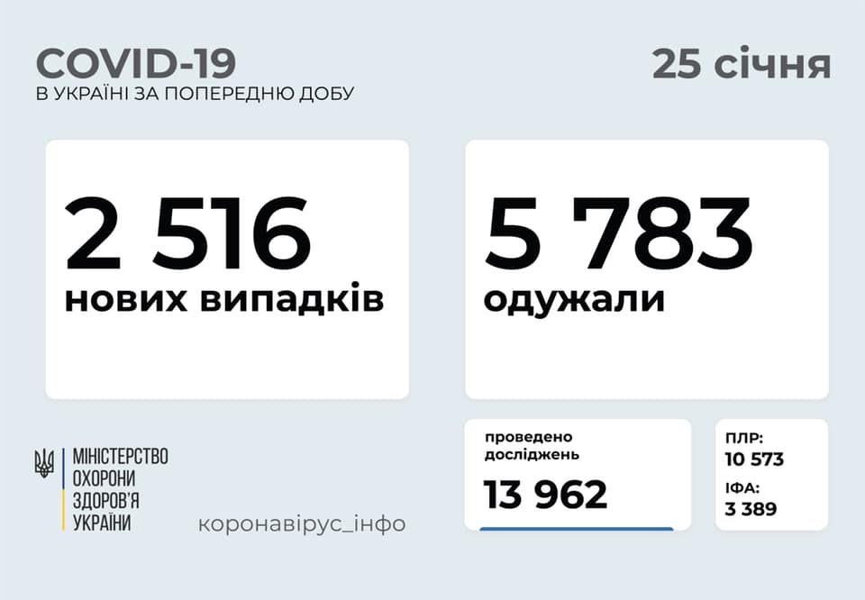 За добу 24 січня в Україні діагноз COVID-19 підтвердили 2 516 людям, госпіталізували 1 166 осіб, не змогли врятувати 63 хворих, водночас одужали 5 783 особи.