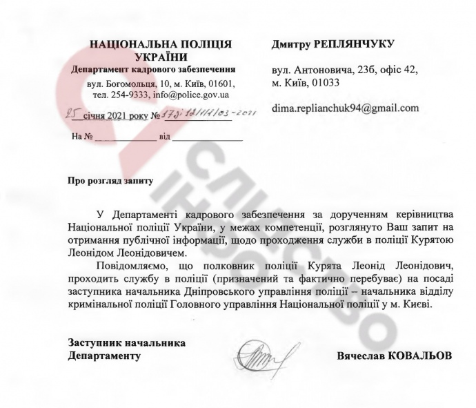 Дослівно: "Полковник поліції Курята Леонід Леонідович проходить службу в поліції на посаді заступника начальника Дніпровського управління поліції — начальника відділу кримінальної поліції Головного управління Національної поліції у місті Києві".