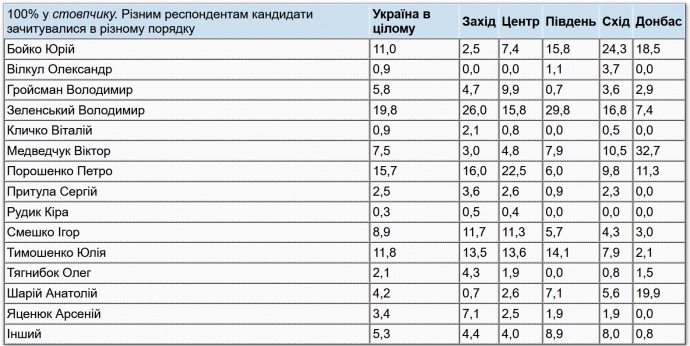 Далі йдуть Юлія Тимошенко (відповідно, 8% і 11,8%), Юрій Бойко (7,4% і 11%), Ігор Смешко (6% і 8,9%), Віктор Медведчук (5% і 7,5%) і Володимир Гройсман (3,9% і 5,8%).