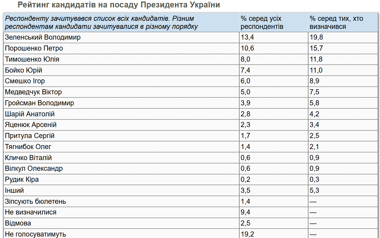 Деталі: Якщо брати усіх опитаних, то за Зеленського віддали б свої голоси 13,4% українців за Порошенка - 10,6%.