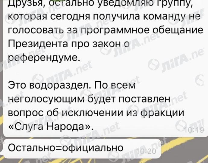 Група нардепів отримала команду не голосувати за закон про референдум, глава фракції Давид Арахамія пригрозив їм виключенням.