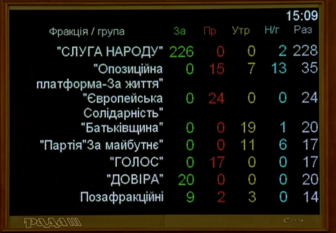 Деталі: За законопроєкт проголосували 255 народних депутатів. Закон підтримали тільки фракція "Слуга народу", група "Довіра" та 9 внефракціонніх нардепів. Як свідчать дані на сайті парламенту, "за" проголосували майже всі "слуги", присутні на засіданні (не голосували Микола Сольський та Вадим Струневич).