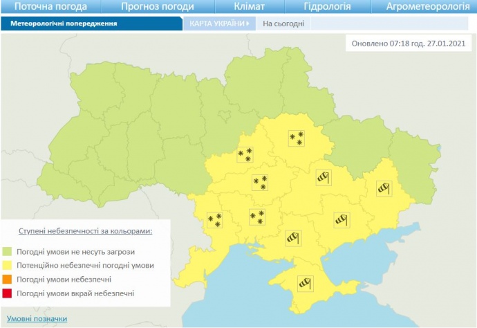Деталі: Синоптики оголосили штормове попрередження (І рівень небезпечності, жовтий) через негоду 27 січня.