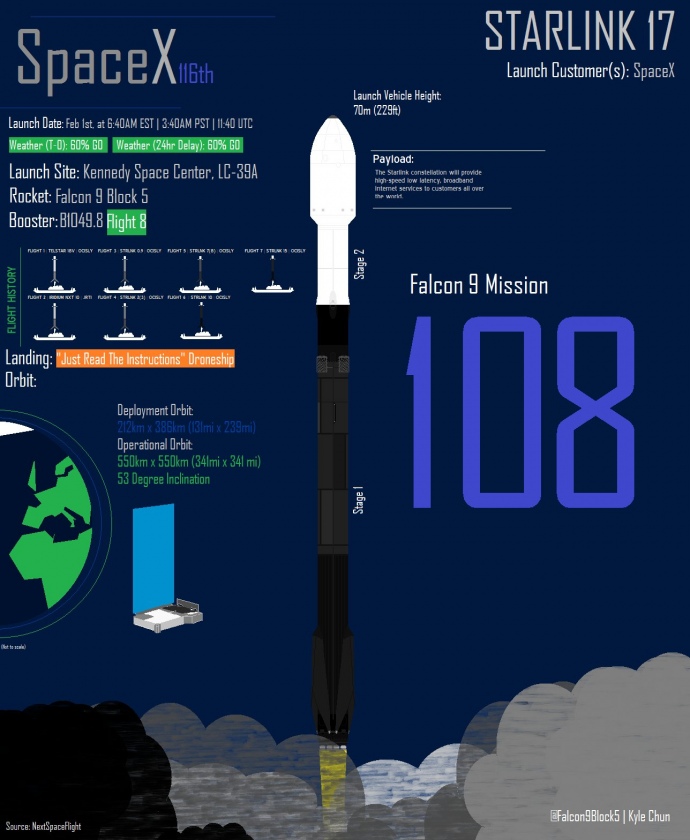 - 20 січня SpaceX доставила на орбіту Землі 17-ту партію інтернет-супутників системи Starlink. На орбіту вантаж вивела ракета-носій Falcon 9, яка до цього успішно виконала сім подібних місій.