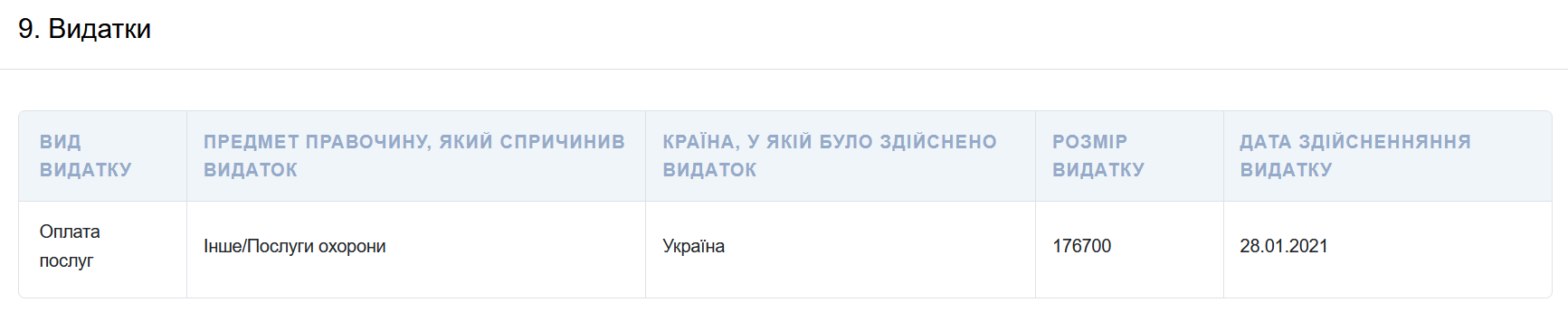 За інформацією Інтерфакс-Україна, у 2020 році він також неодноразово декларував оплату охорони його рухомого майна, зокрема, в жовтні - 158,1 тис. грн, у вересні - на 1,24 млн грн.