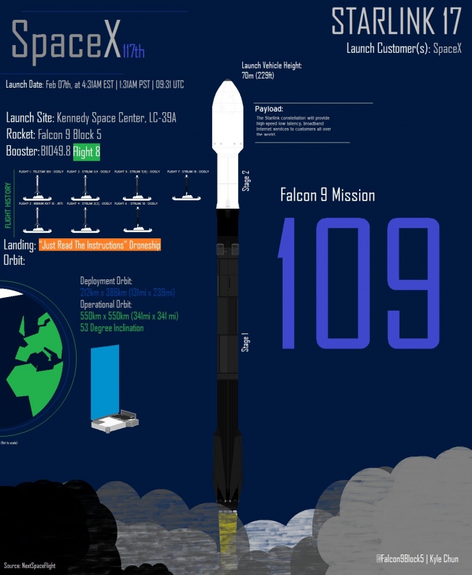 - 20 січня SpaceX доставила на орбіту Землі 17-ту партію інтернет-супутників системи Starlink. На орбіту вантаж вивела ракета-носій Falcon 9, яка до цього успішно виконала сім подібних місій.